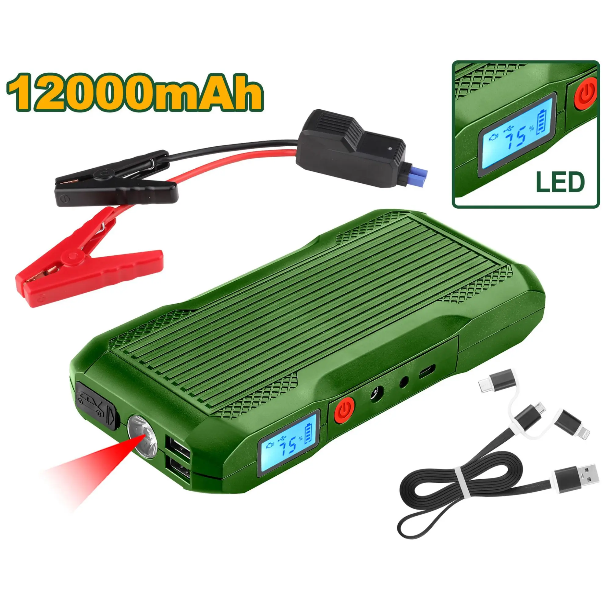 – Funciona como arrancador de vehículos, banco de energía (Power Bank) para dispositivos móviles y linterna de emergencia.