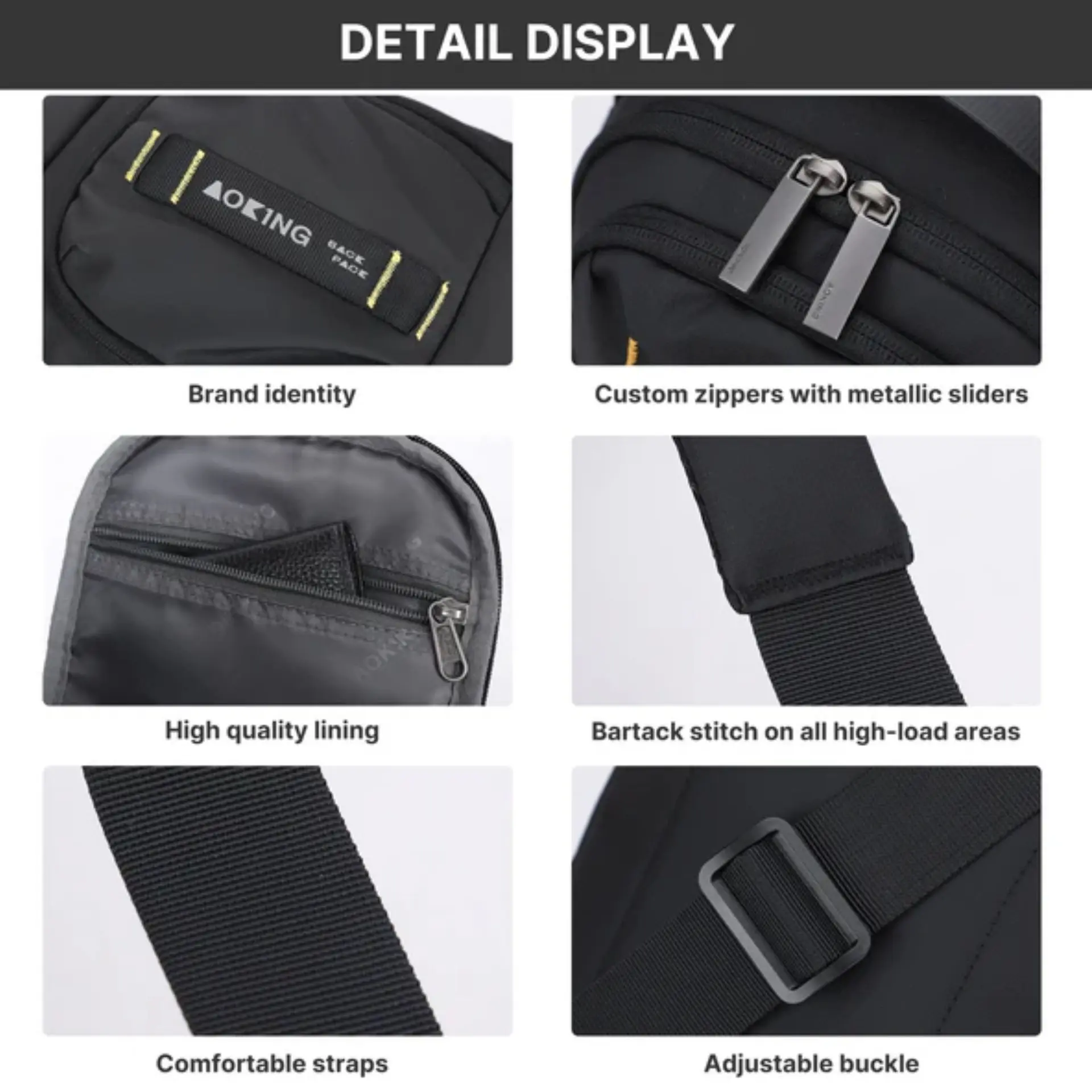 – La correa suele ser de nailon reforzado con un sistema de ajuste rápido y un broche de seguridad de alta presión.Panel trasero con tecnología de malla 3D transpirable que separa el bolso de tu cuerpo, facilitando la ventilación y evitando que el material encerado genere calor excesivo.