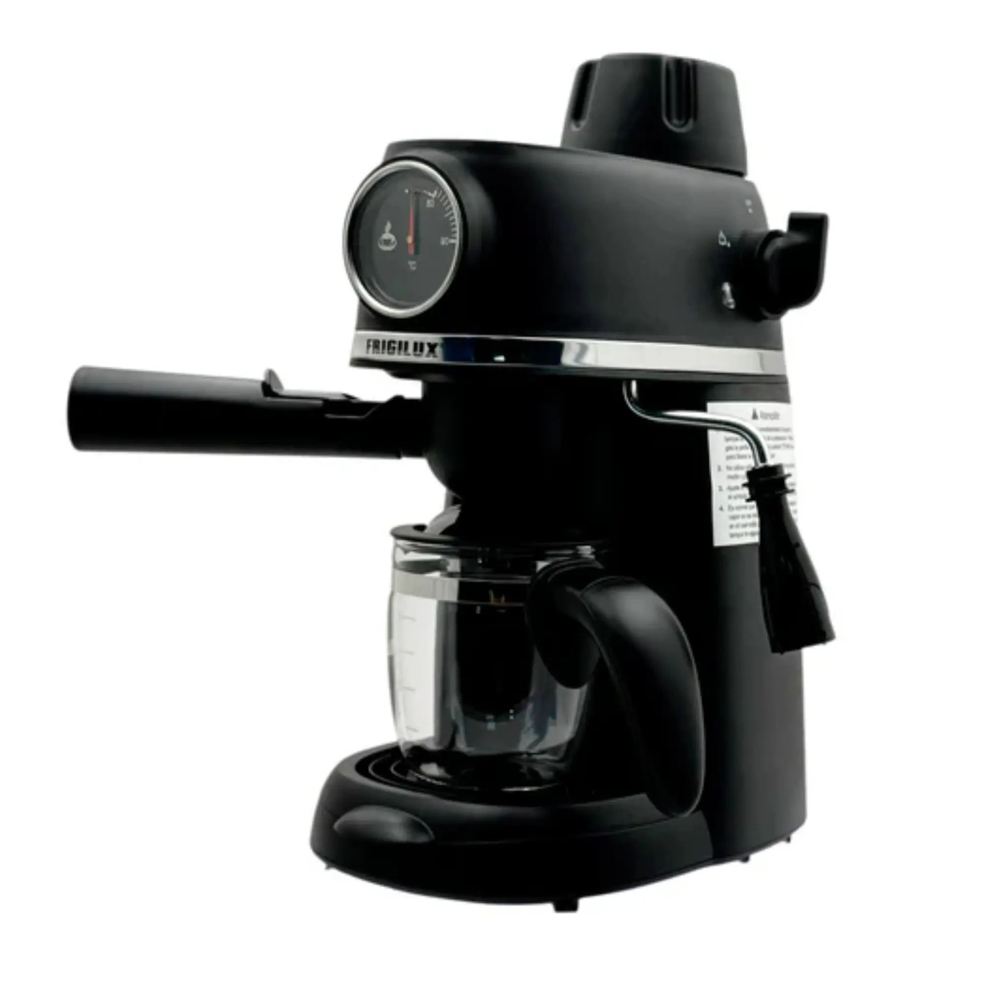 La cafetera eléctrica Frigilux con estas características es un modelo compacto diseñado para los amantes del café que buscan preparar bebidas tipo Espresso y Capuchino en casa, operando mediante vapor y baja presión.