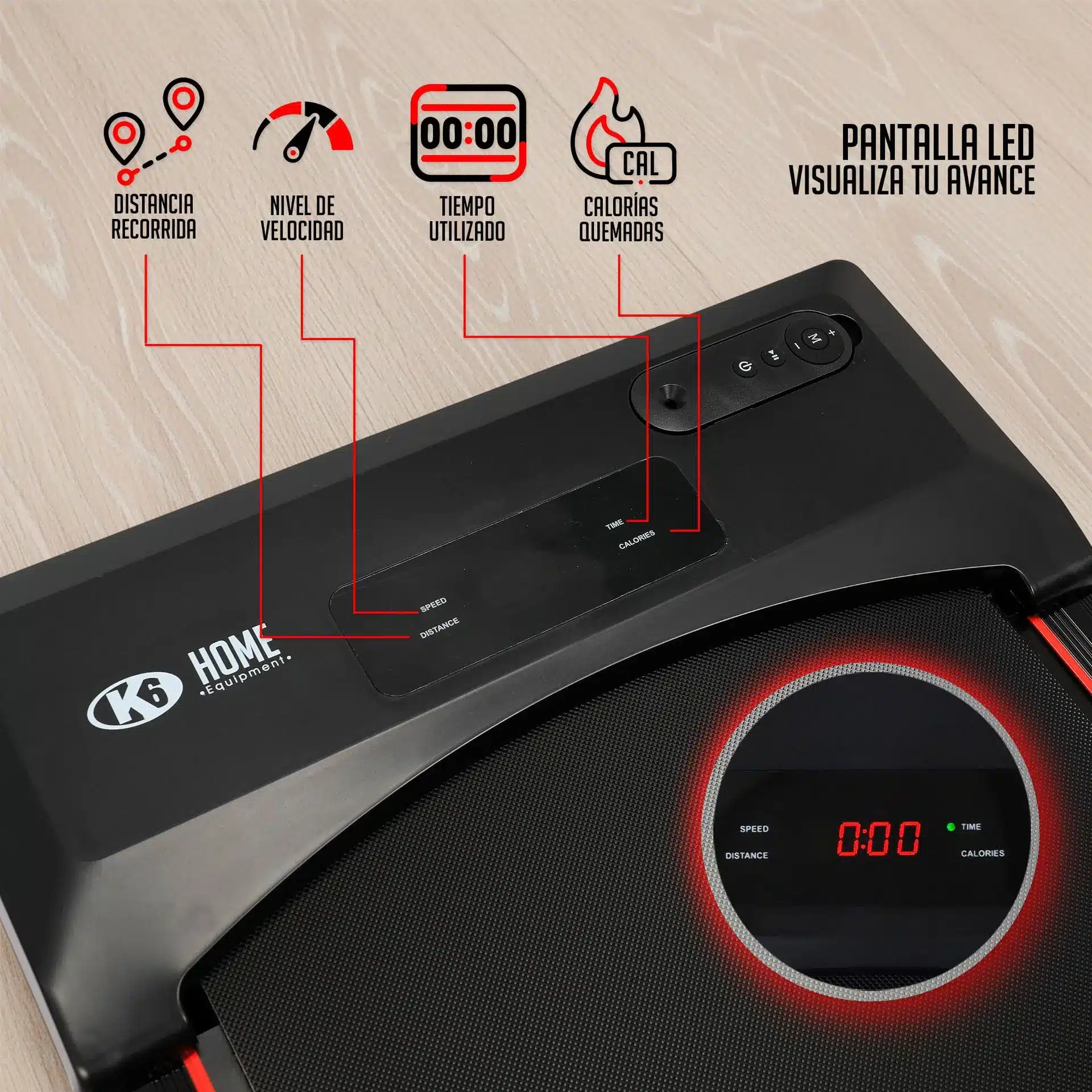 -Pantalla LED: Visualiza información clave como velocidad, tiempo, calorías quemadas y distancia recorrida.