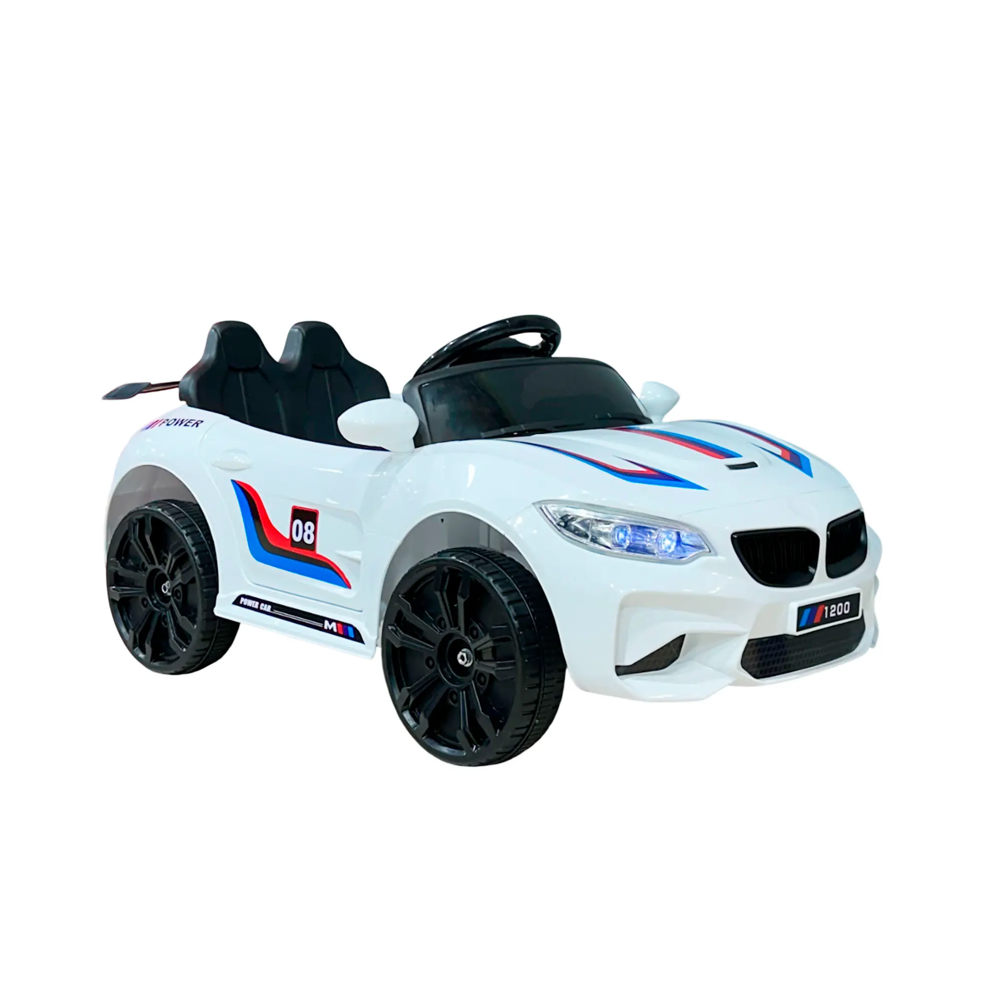 -Diseño Elegante y Deportivo: Con un acabado brillante en color blanco y líneas aerodinámicas, este carro eléctrico imita el estilo distintivo de un BM, capturando la atención de todos.