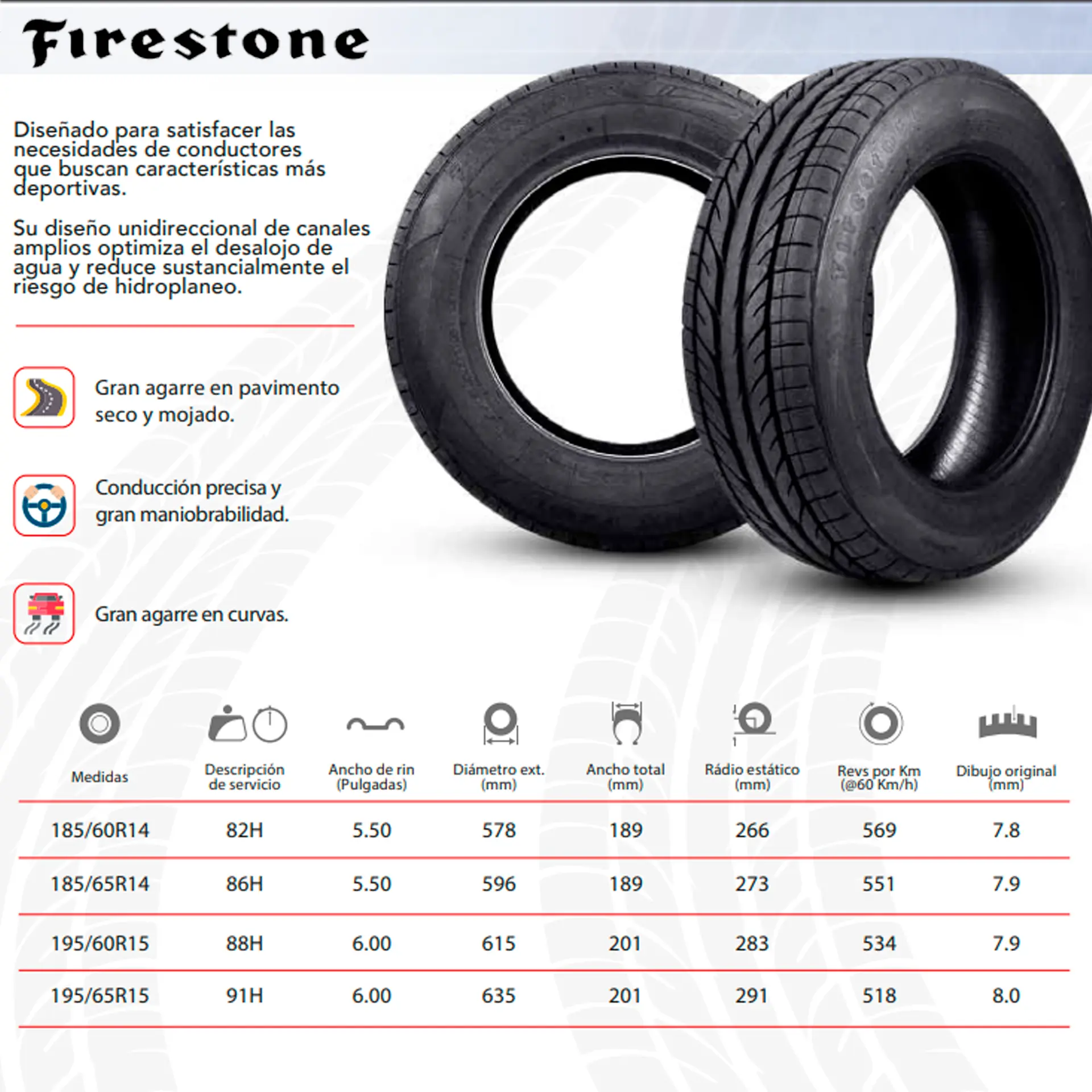 Diseñado para satisfacer las necesidades de conductores que buscan emular un desempeño deportivo. Ofrece gran desempeño en pisos secos y mojados. Su diseño unidireccional de canales amplios optimiza la evacuación de agua y reduce sustancialmente el riesgo de hidroplaneo.