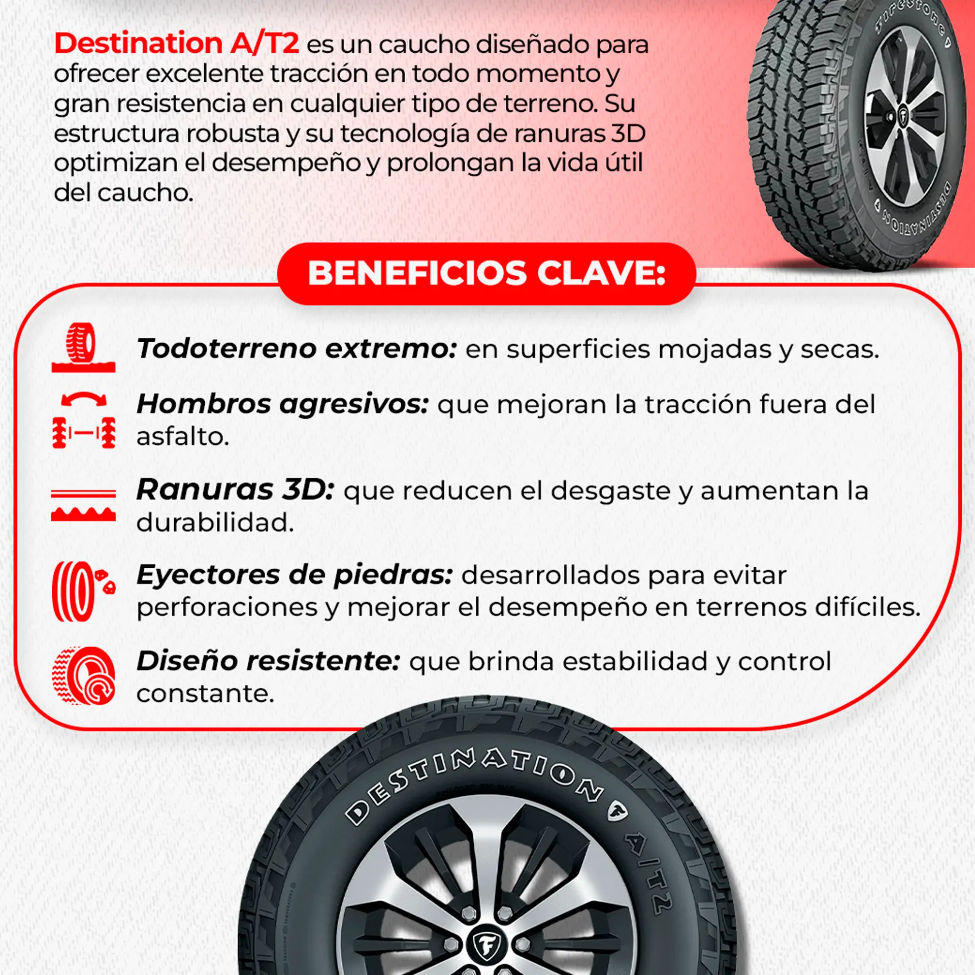 El caucho Firestone P265/75R16 114T Destination A/T2 es una excelente opción para aquellos que buscan un neumático todo terreno que combine un excelente rendimiento fuera de la carretera con un buen rendimiento en carretera. Proporciona tracción, durabilidad y comodidad en una variedad de condiciones de manejo.