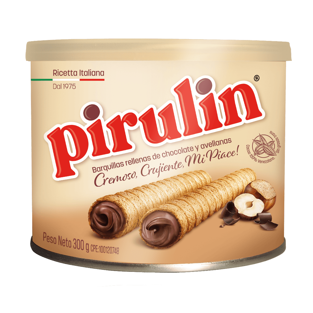 Disfruta de nuestro sabor tradicional, tu PIRULIN de siempre, relleno con una exquisita crema de cacao venezolano con pasta de avellana, probarlo es darte un momento de felicidad.