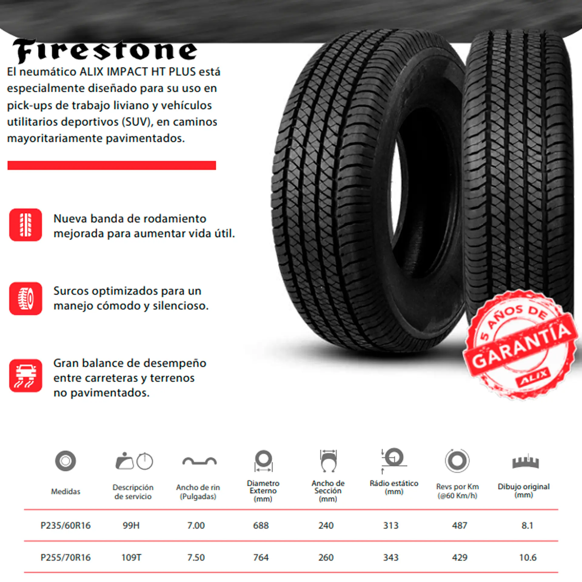 Los cauchos Firestone Impact HT plus son perfectos para suelo pavimentado y cualquier clase de clima. Otorgan un gran desempeño en pavimento seco y mojado y una alta resistencia al desgaste irregular.