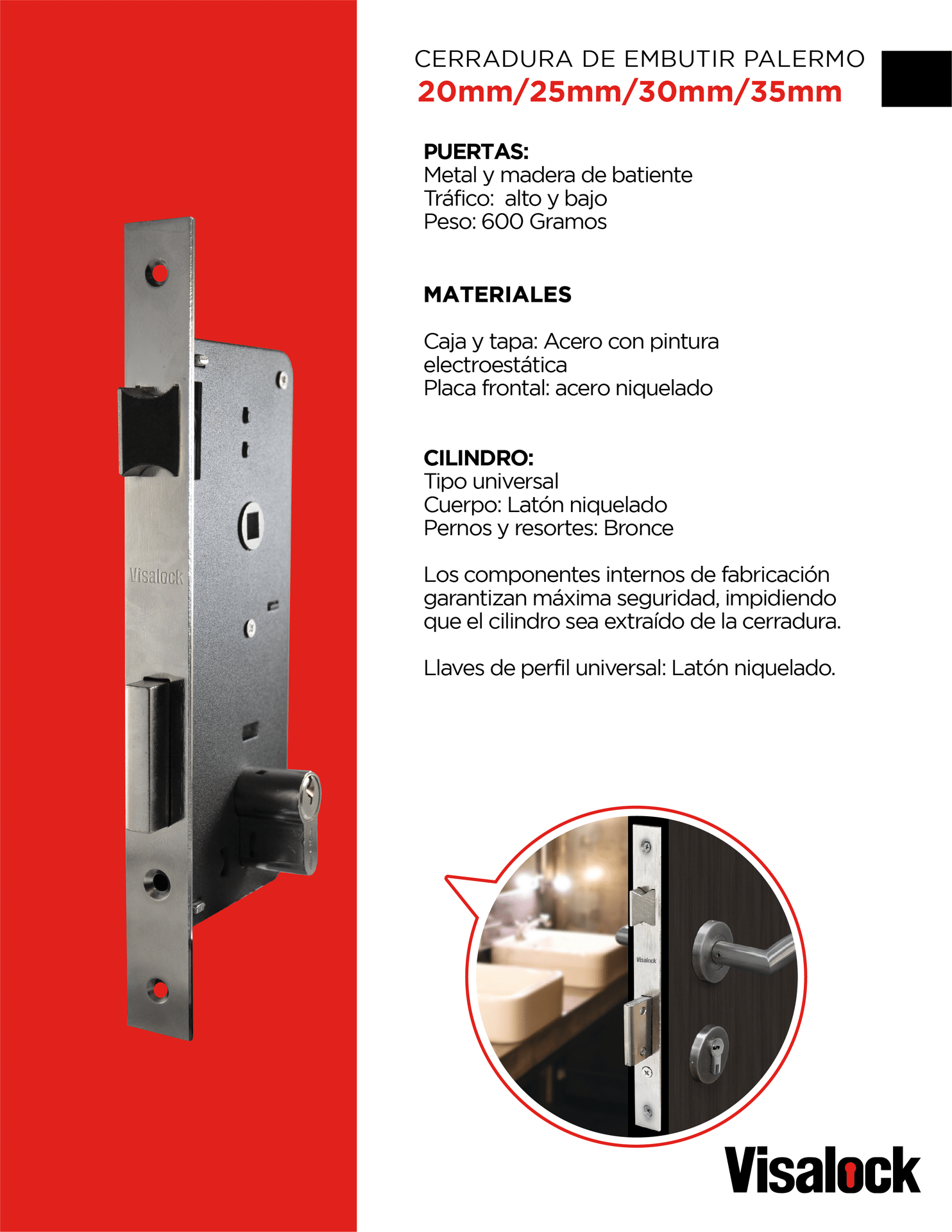 – Cerradura de seguridad con 2 puntos de cierre y cerrojo de acero de 2 pases para asegurar puertas batientes.