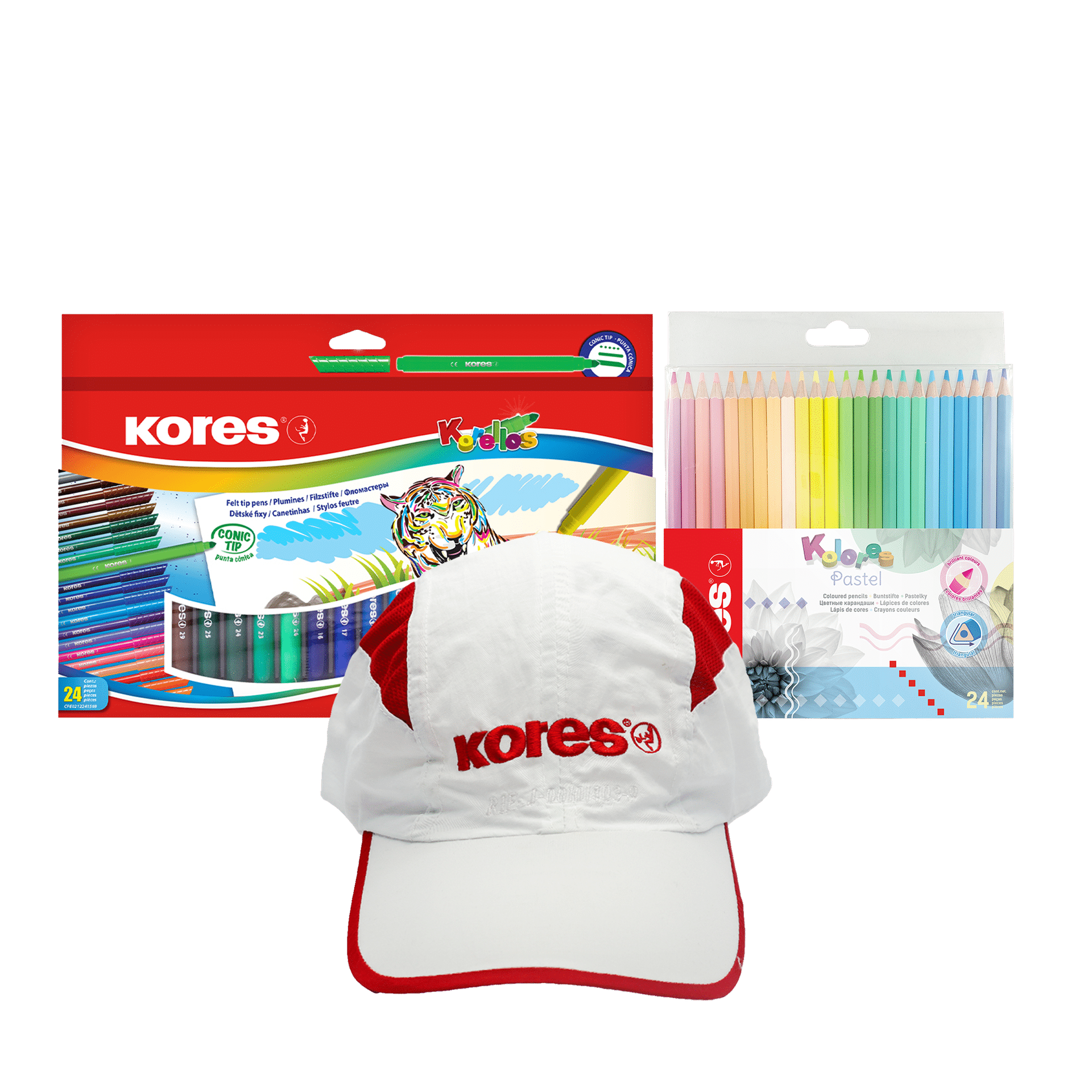 – Contenido del empaque: 1 set de creyones tonos pasteles, 1 set marcadores y 1 gorra.