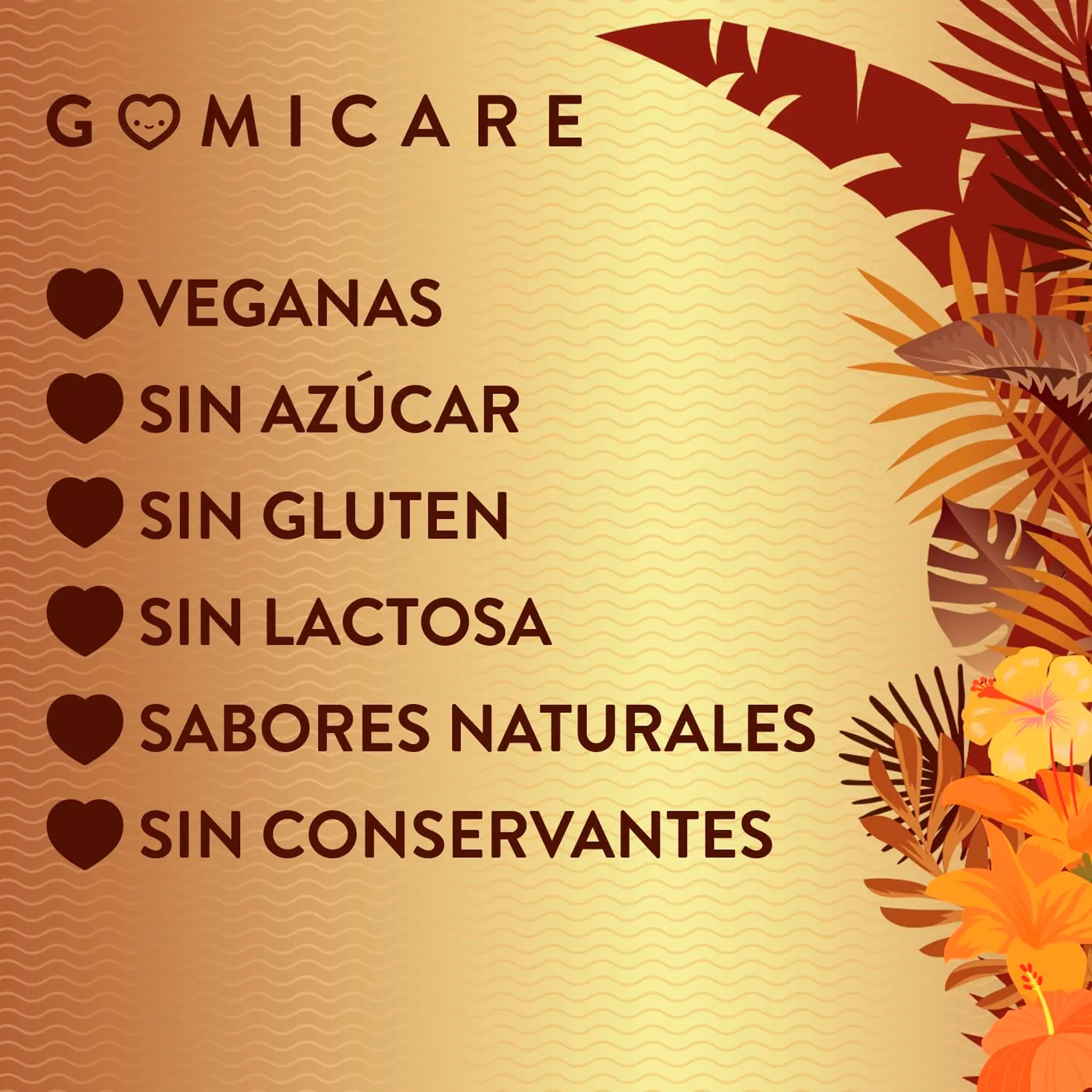 -100 % veganas y sin azúcar, con colorantes naturales: Son fabricadas a base de pectina de origen vegetal y no llevan azúcar. Todas las gomitas de Gomicare son veganas, sin azúcar, sin gluten, sin lactosa, sin colorantes artificiales, sin ogm.