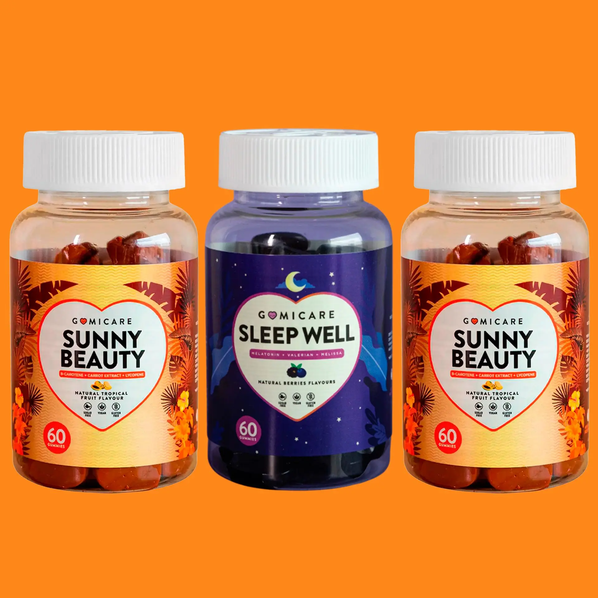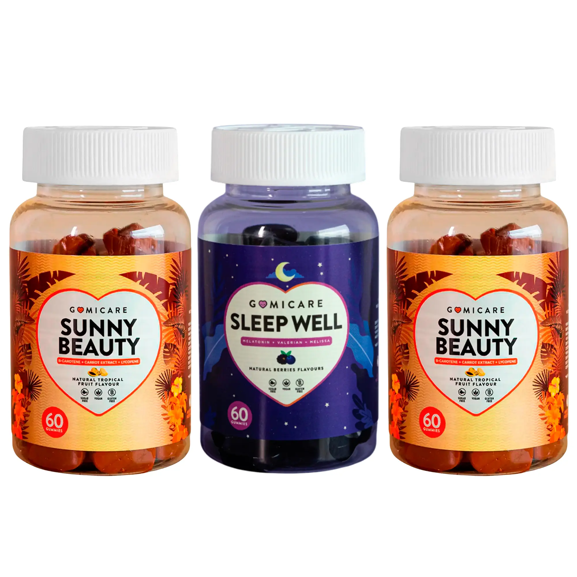 Combo Suplemento para Protección de la Piel Gomicare Sunny Beauty Frutas Tropicales 60 Gomitas 2unds + Suplemento para Dormir Gomicare Sleep Well Arándano y Uva 60 Gomitas 1und