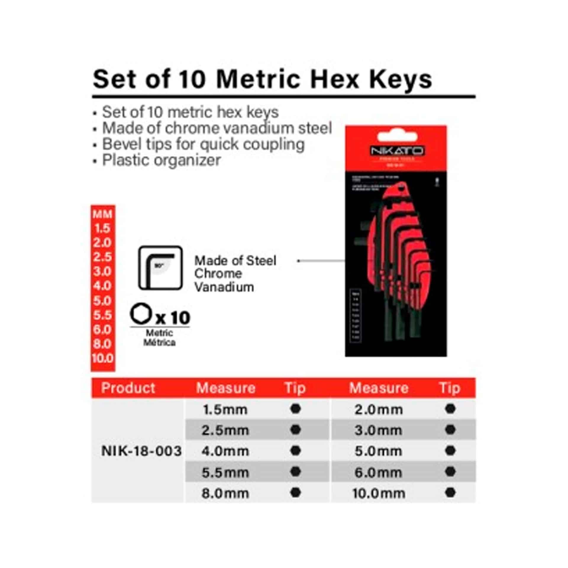 Juego de 10 llaves hexagonales métricas Nikatto de alta calidad y resistencia.