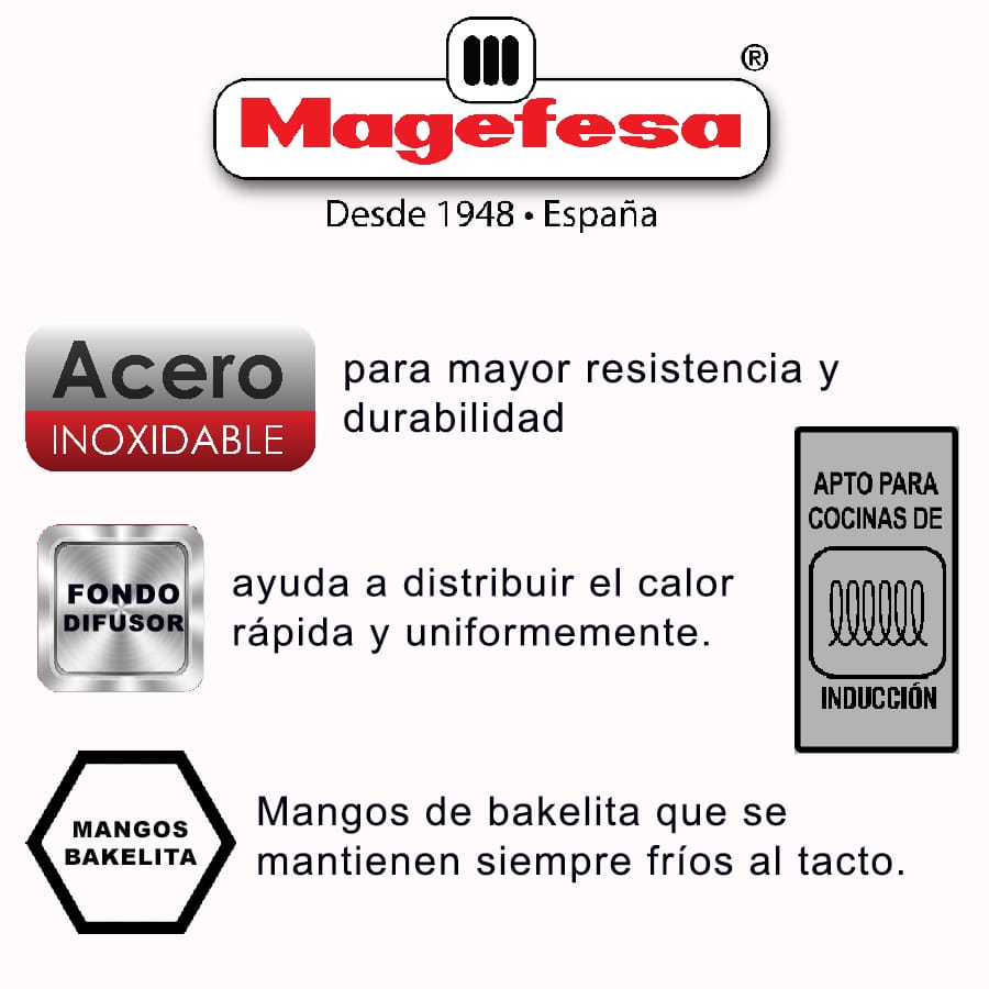 - Contenido del empaque: Batería 07 piezas Acero Inoxidable Línea Practix Magefesa