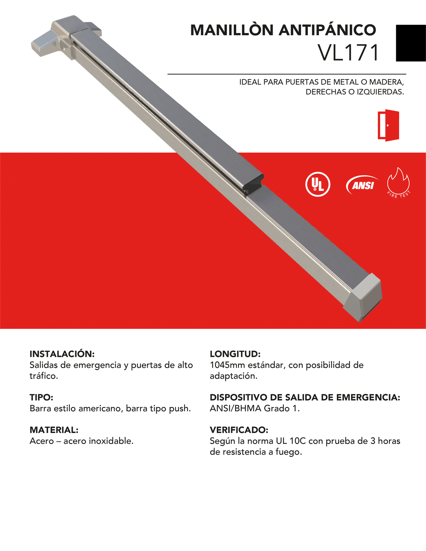 – Dispositivo de emergencia: ANSI/BHMA Grado 1.