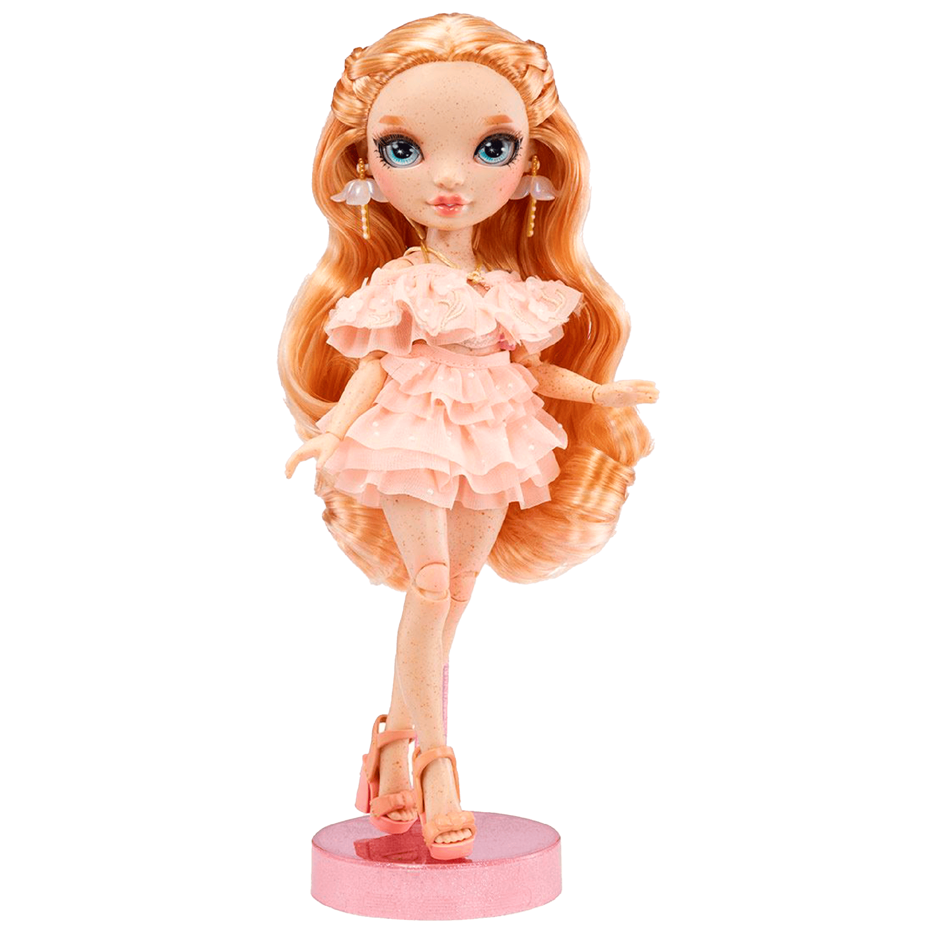 -Expresa su propio estilo con un top y una falda con volados a juego con detalles de tachuelas de perlas, aretes de flores, un par de tacones con lazo rosa y divertidos accesorios. Y tiene un hermoso cabello largo y rizado de color rosa claro, pestañas largas reales y ojos de vidriosos.