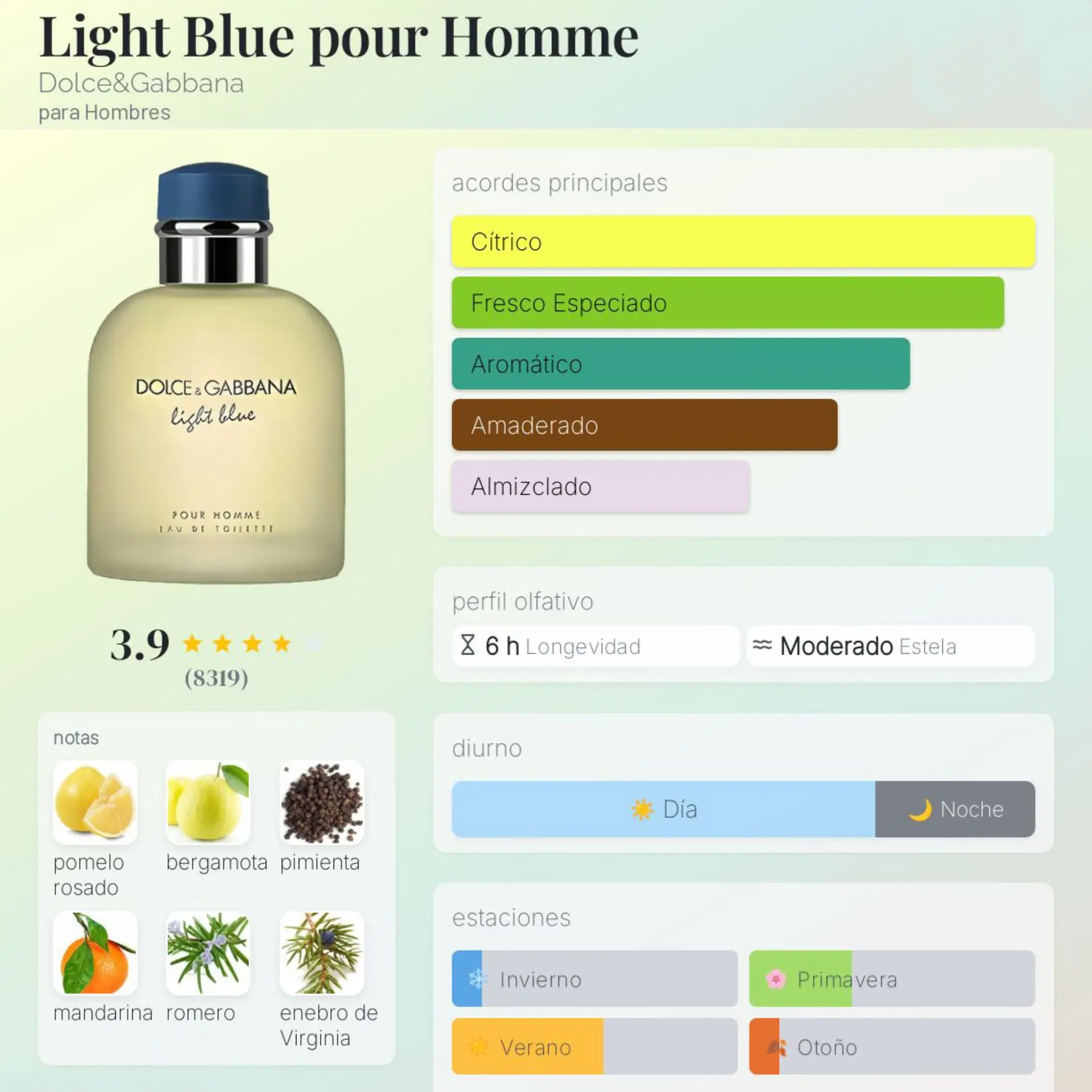 – Notas de Salida : Mandarina siciliana, enebro de Virginia, toronja (pomelo) y bergamota. Es una explosión de frescura cítrica.
