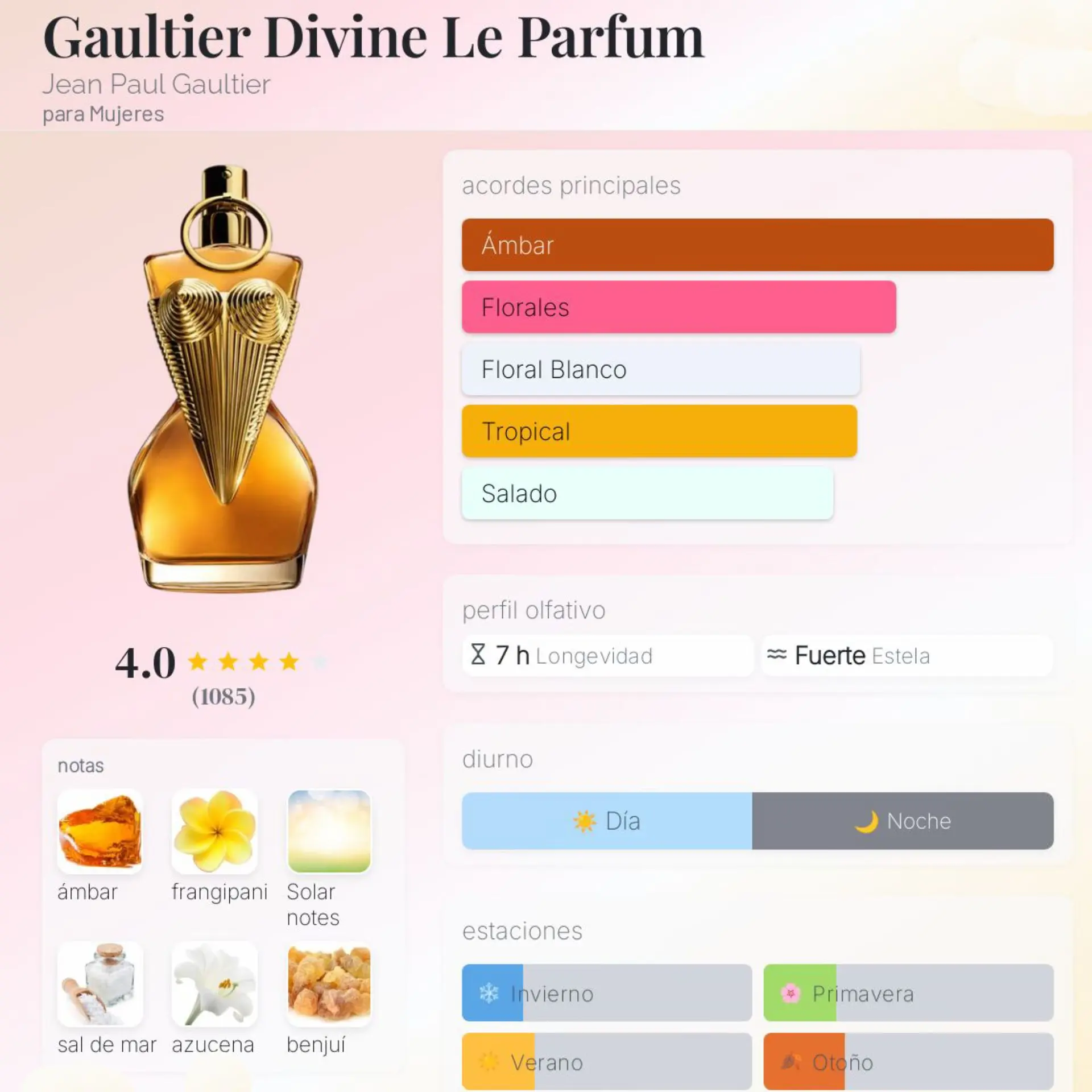 El perfume Gaultier Divine es una fragancia de la familia olfativa Oriental Floral para mujeres. Se presenta como un aroma radiante, sofisticado y con un toque marino que la hace única. Es la personificación de una diosa moderna: solar, libre y poderosa.