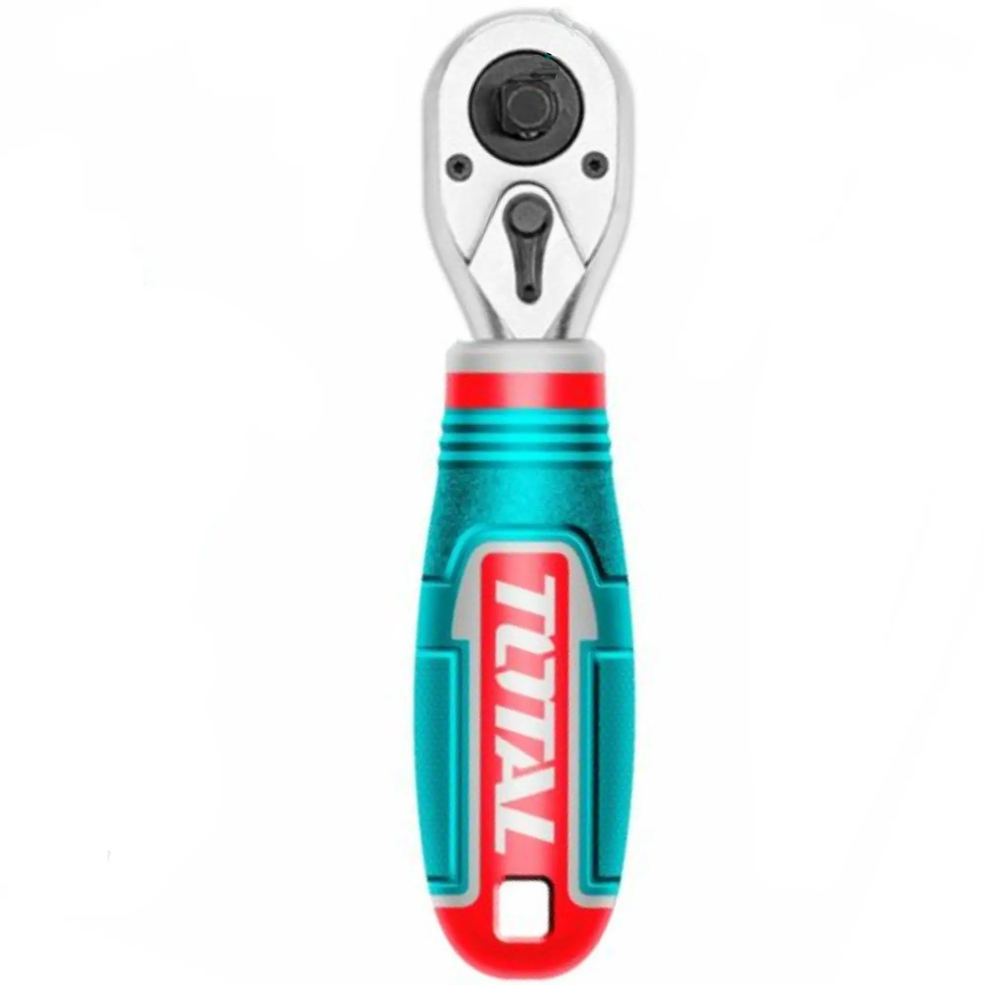 Este es un mango de trinquete (rachet) doble de la marca Total. Su principal ventaja es la versatilidad al incorporar los dos tamaños de encastre más comunes en una sola herramienta.