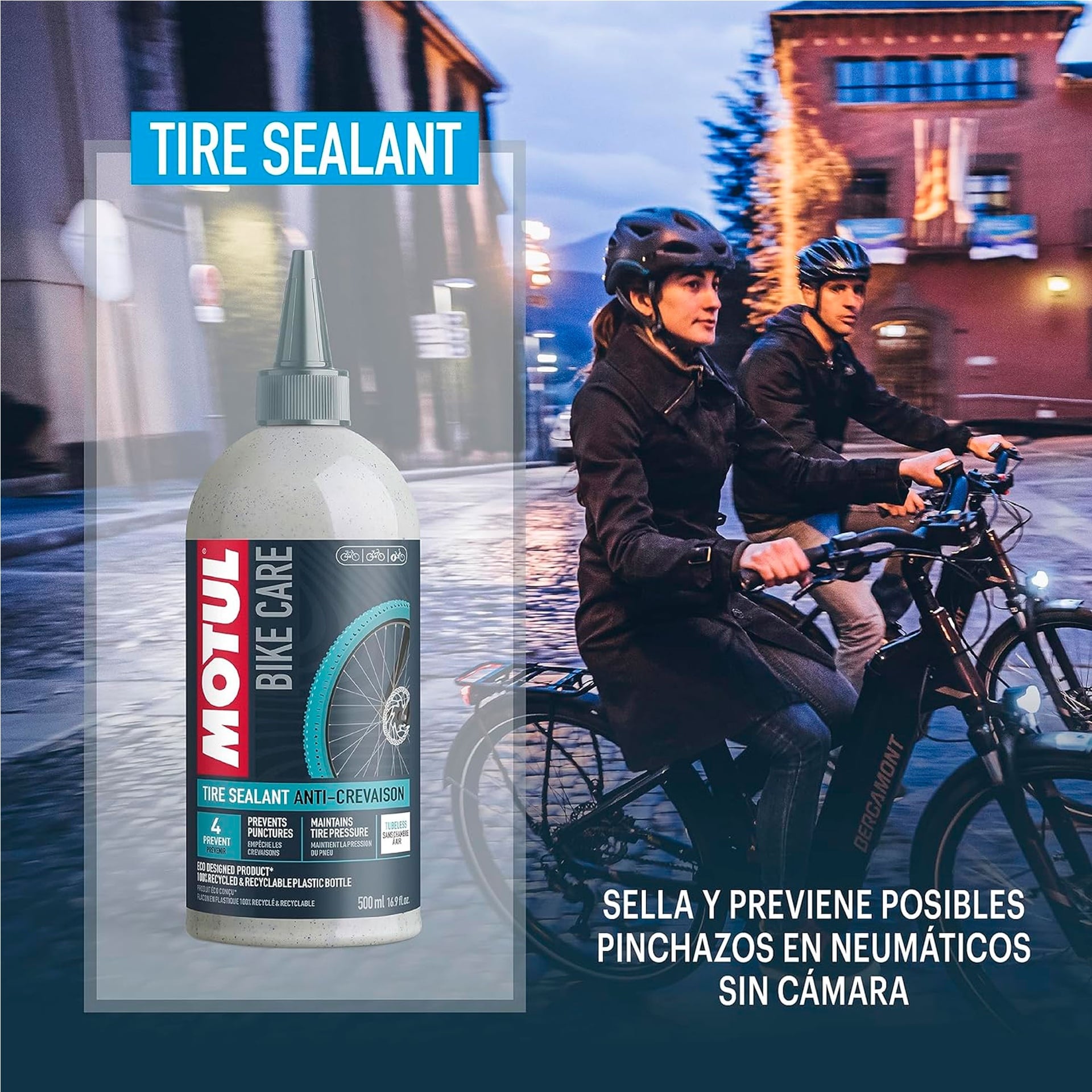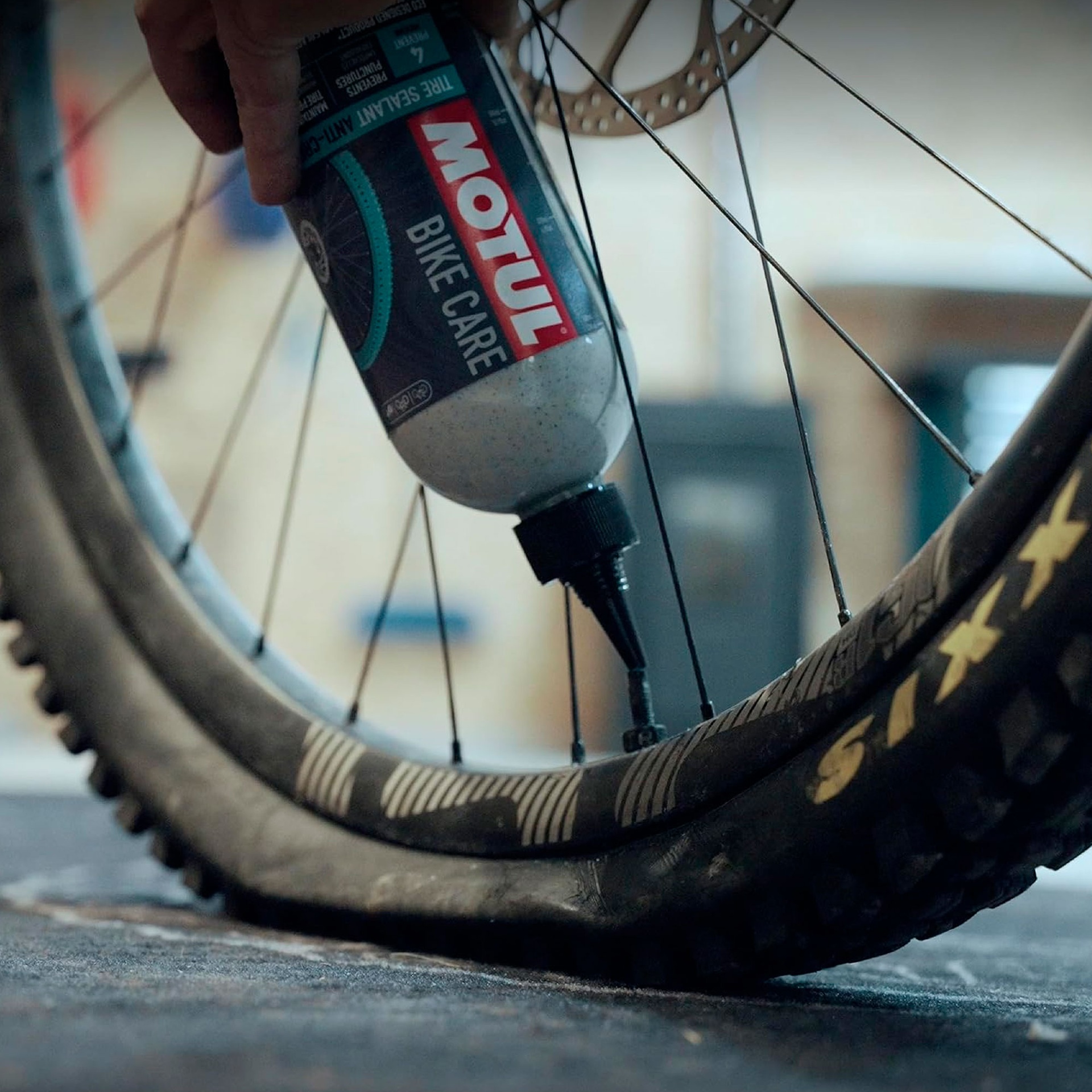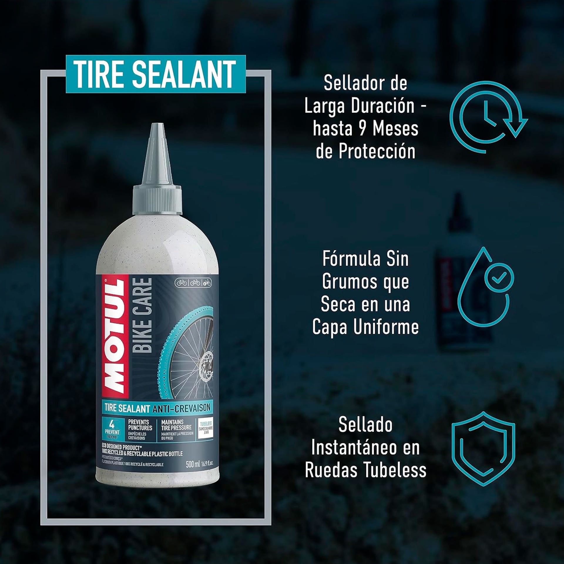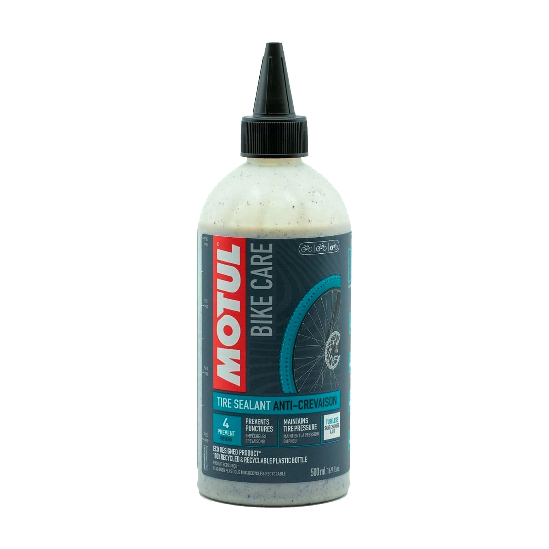 MOTUL Tubeless Tire Sealant restaura la estanqueidad tapando los poros y orificios ocasionados por los pinchazos pequeños y medianos en todos los neumáticos de bicicleta sin cámara. Actúa inmediatamente cuando se aplica en los neumáticos sin cámara de bicicleta.