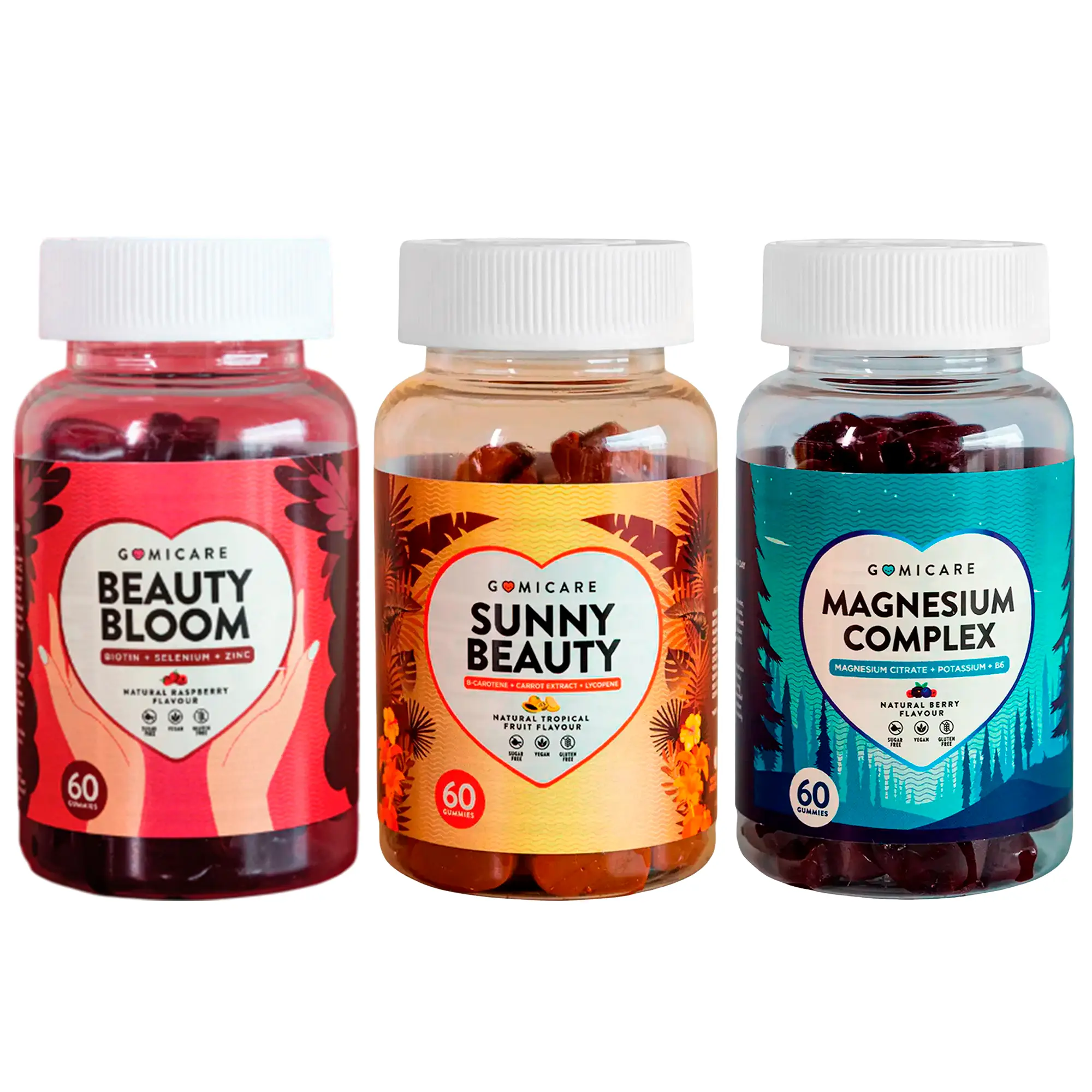 Suplemento Vitaminas Gomicare Beauty Bloom 60 Gomitas + Suplemento Magnesio Gomicare Magnesium Complex 60 Gomitas + Suplemento para Protección de la Piel Gomicare Sunny Beauty 60 Gomitas