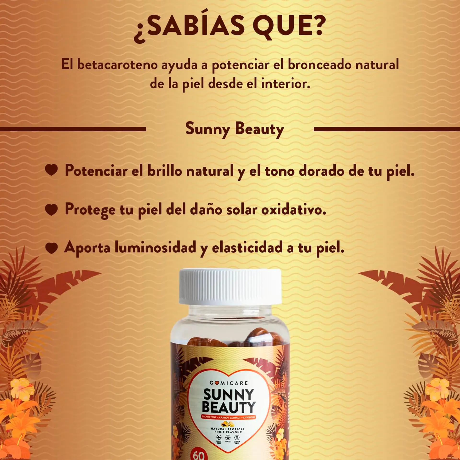 -Gomicare sunny beauty: con betacaroteno, astaxantina, licopeno, luteína, cobre, extracto de zanahoria, vitamina C y vitamina E. Aptas para niños y adultos. Formuladas para proteger la piel del sol y acelerar el bronceado. Toma 2 gomitas al día, sin necesidad de agua. Cada bote contiene 60 gominolas para un suministro de 1 mes (2 gummies por día).
