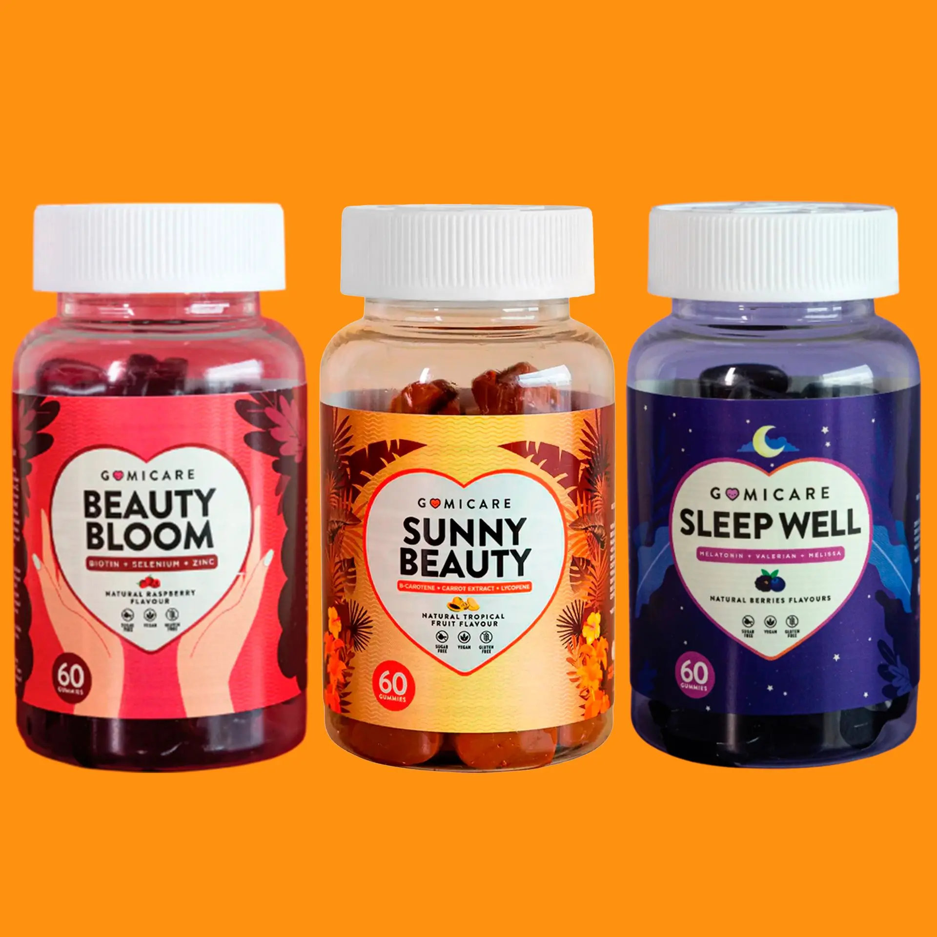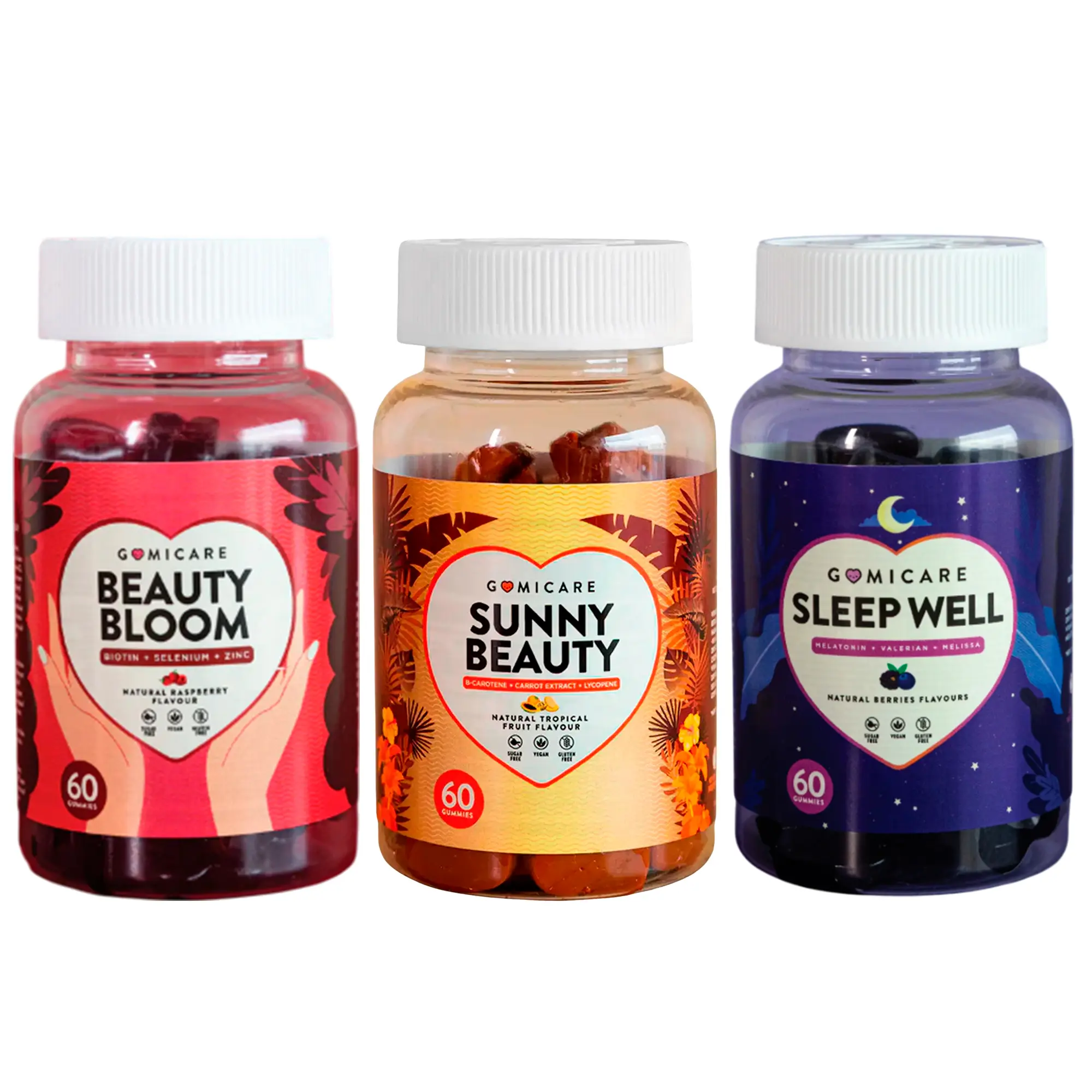 Suplemento Vitaminas Gomicare Beauty Bloom 60 Gomitas + Suplemento para Dormir Gomicare Sleep Well 60 Gomitas + Suplemento para Protección de la Piel Gomicare Sunny Beauty 60 Gomitas