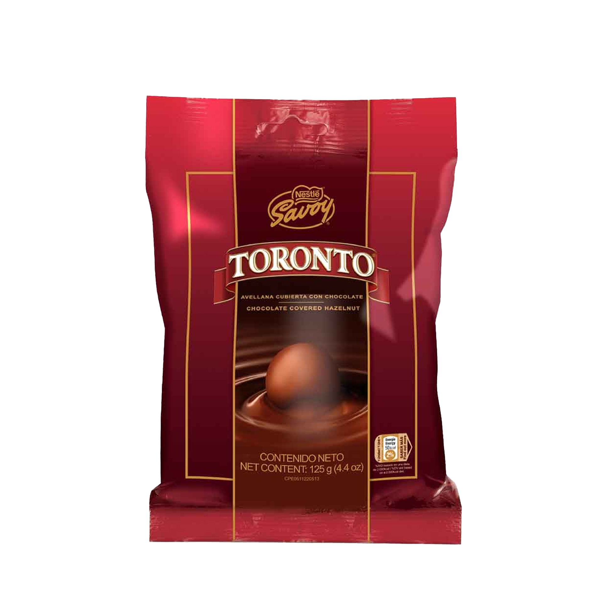 TORONTO Bolsa es una presentación de 125 gr de avellanas cubiertas con chocolate.